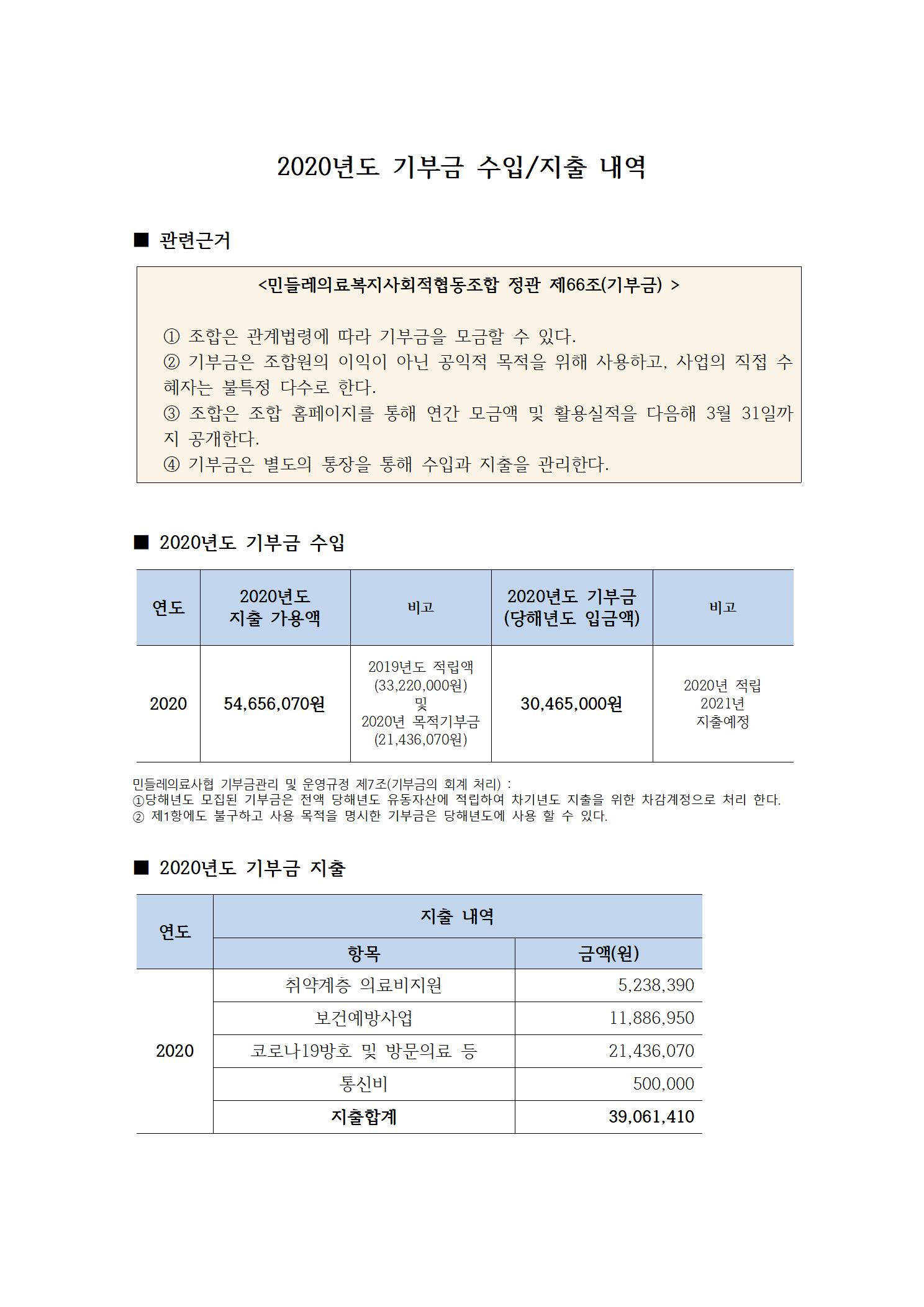 2020년 기부금 수입지출내역 보고