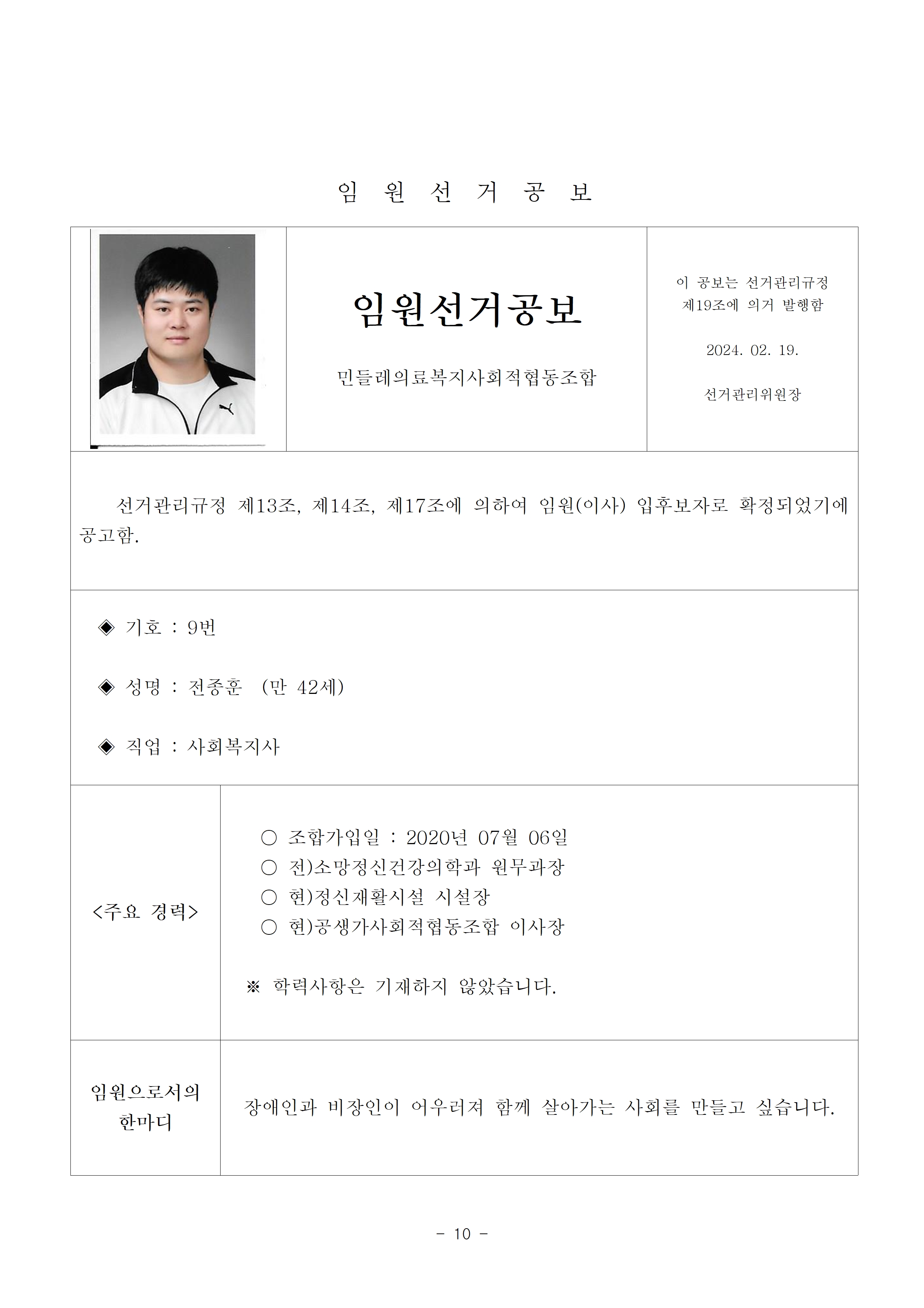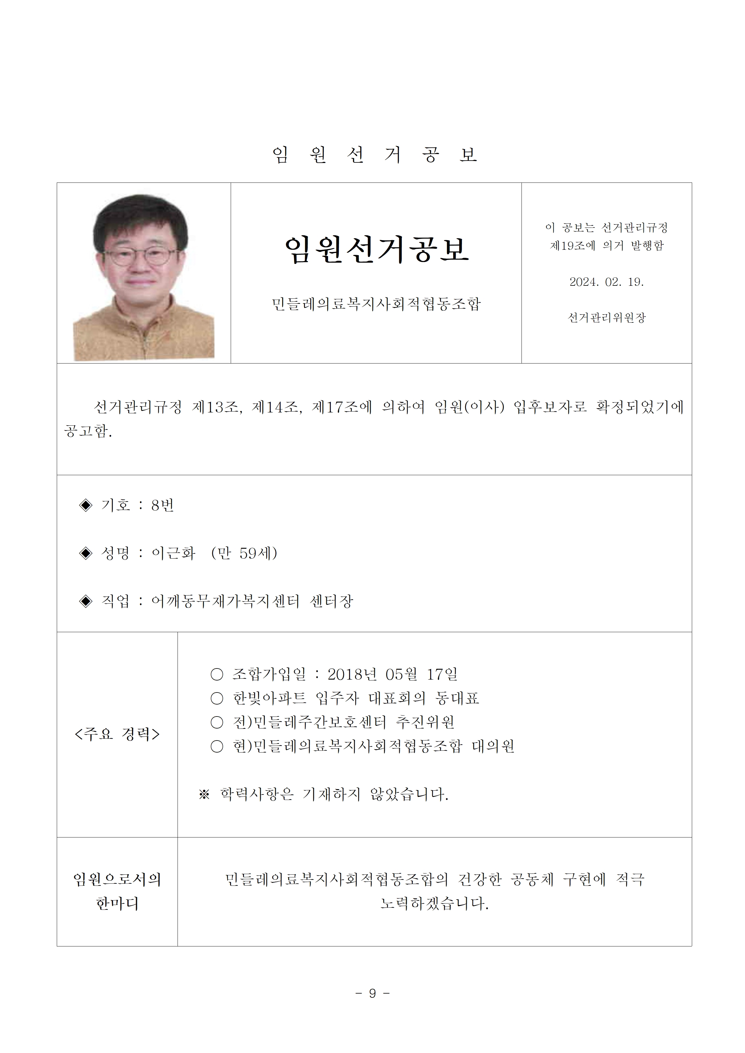 2024년 민들레의료사협 임원(이사, 감사)선거 공보 상세내용