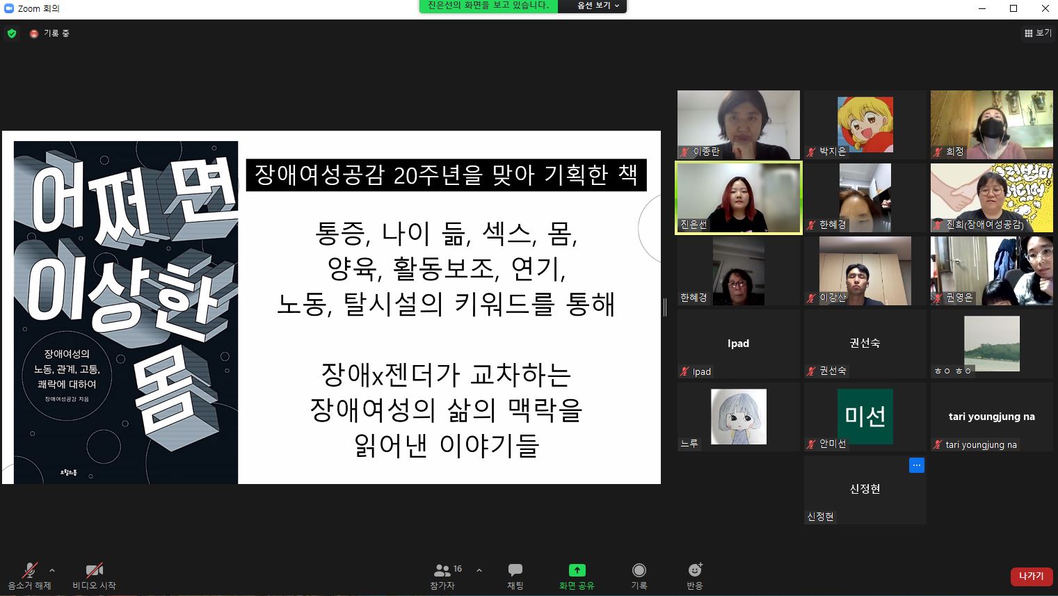 장애+여성의 조합으로 활동을 해온 여성 장애인 활동가의 생애사를 기록한 책인 "어쩌다 이상한 몸" 저자 초청 독서모임에 참여. 정상성 기준이 엄격한 한국에서 장애와 비장애를 가르고, 차별과 낙인을 통해 소수자를 고통스럽게 하는 사회에 대해 성찰할 수 있었음. 또한, 소수자들의 목소리를 직접 들음으로써 우리가 소수자들로부터 얼마나 멀리 떨어져 살아가고 있는지 알 수 있었음.